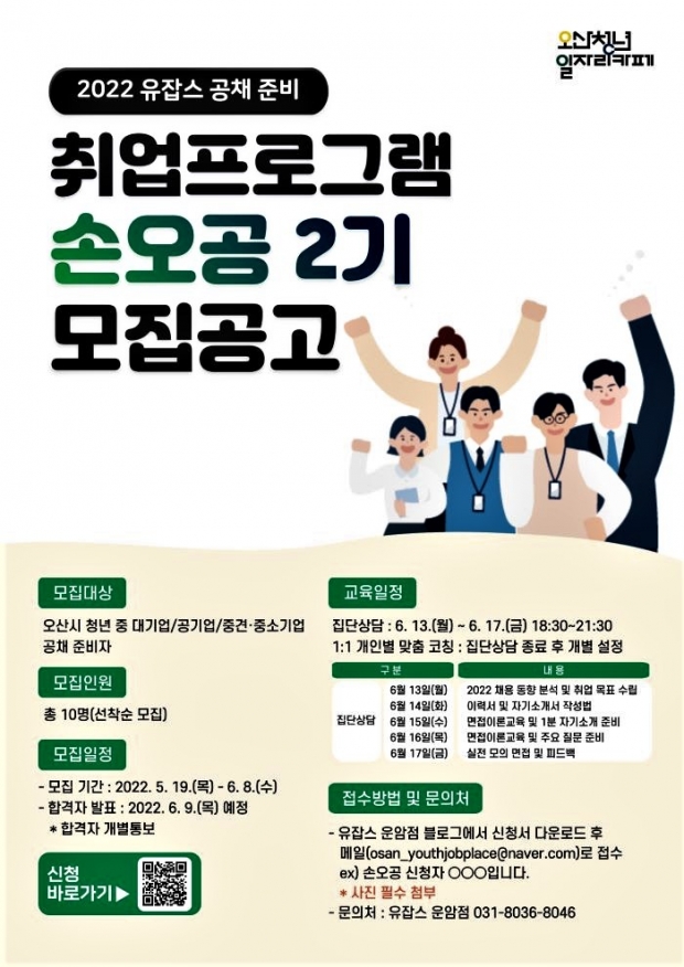 ‘손·오·공’은 손에 꼽히는 오산시 공채준비반의 약칭으로 △2022 채용 동향 분석 및 취업 목표 수립 △이력서·자기소개서 작성 △실전 모의 면접 등의 내용으로 청년 구직자들에게 체계적인 취업 준비를 지원하는 프로그램이다.