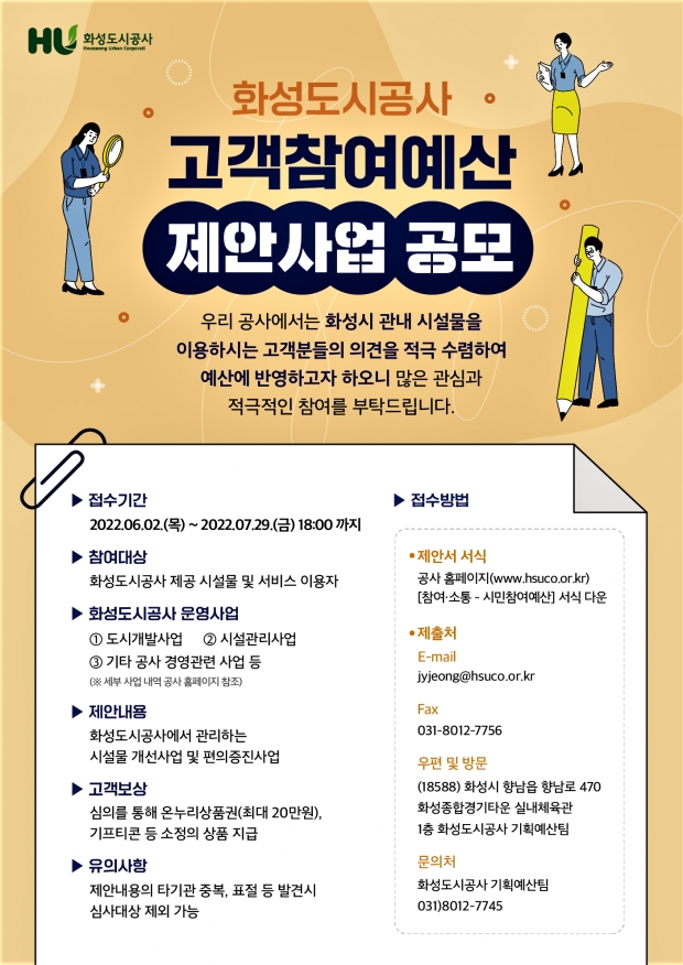 제안서 서식은 ‘화성도시공사 홈페이지-참여·소통-고객참여예산 페이지’에서 내려받을 수 있으며, 작성한 제안서는 이메일, 팩스, 우편, 방문을 통해 제출 가능하다.