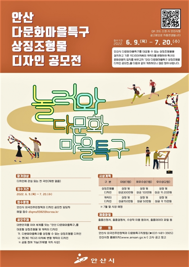 경기 안산시는 다문화마을특구를 대표할 참신하고 다양한 상징조형물과 캐릭터를 발굴하기 위해 ‘다문화마을특구 상징조형물 디자인 공모전’을 개최한다고 15일 밝혔다.