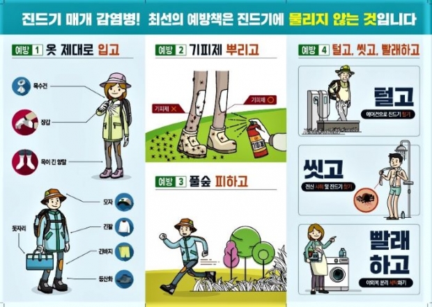 진드기 매개 감염병은 치료제와 예방백신이 없어 예방수칙을 철저히 지켜 진드기에 물리지 않는 것이 최선의 예방법이다. 등산, 농작업 등 야외활동 시 △긴 소매, 긴 바지, 모자, 장화 착용 △기피제 사용(피부가 아닌 옷 위에 뿌리기) △귀가 후 바로 샤워 및 활동복 분리 세탁 등 예방수칙을 지켜야 한다.
